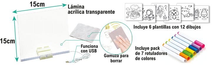Incluye todo lo necesario para empezar a crear al instante: un pack de 7 rotuladores de colores, 6 plantillas con 12 dibujos para inspirar a los más pequeños y una práctica gamuza para borrar. Además, funciona mediante conexión USB, lo que asegura un uso cómodo y continuo sin depender de pilas.