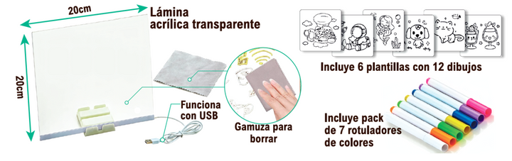 Incluye todo lo necesario para empezar a crear al instante: un pack de 7 rotuladores de colores, 6 plantillas con 12 dibujos para inspirar a los más pequeños y una práctica gamuza para borrar. Además, funciona mediante conexión USB, lo que asegura un uso cómodo y continuo sin depender de pilas.